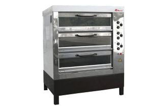 Печь хлебопекарная электрическая ХПЭ-750/3 С предназначена для выпечки широкого ассортимента хлеба, хлебобулочных, мучных кондитерских изделий и приготовления мясных, рыбных и других блюд на предприятиях общественного питания. Печь имеет три автономные пекарные камеры, с раздельным нагревом пода и свода. Обеспечивается возможность пароувлажнения воздушной среды в пекарных камерах. Печь снабжена стеклянными дверками для наблюдения за процессом выпечки. Задание температуры пода и свода каждой пекарной камеры и времени выпечки производится с панели управления. Температура поддерживается автоматически. По окончании выпечки выдаётся звуковая и световая сигнализация.