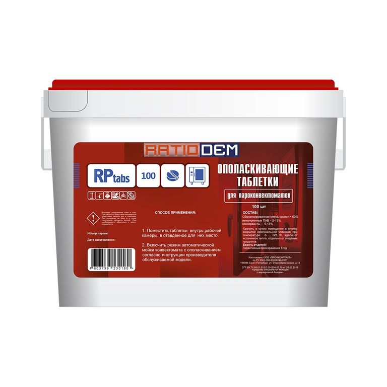 ДЛЯ RATIONAL Средство ополаскивающие таблетки для пароконвектоматов (кислотное средство). 100 упаковок 400() таблеток), Обеспечивают быстрое высыхание чистой внутренней поверхности не оставляя разводов, придают эффект блеска. Нейтрализует остатки моющего щелочного средства. Не имеет запаха. Не содержит хлора и фосфатов. Для одного цикла ополаскивания требуется 4 таблетки. RatioDem RP tabs 100, pH - 2 Состав: сбалансированная смесь кислот >60%; неионогенные ПАВ 5-15%; консерванты 5-15%